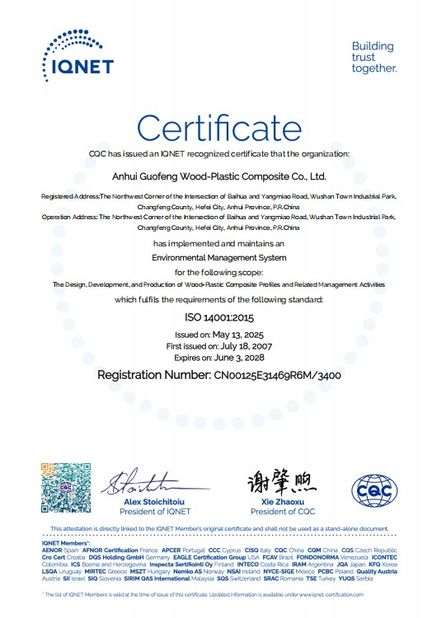 표준:ISO9001 번호:00122Q33631R5M/3400 발급 일자:2022-05-26 유효 기간:2025-05-28 범위 / 범위:Design,Development and production of wood plastic profiles 발행:CQC |